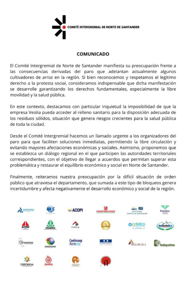 El Comité Intergremial de Norte de Santander expresa preocupación por el paro de algunos cultivadores de arroz. Respetamos el derecho a la protesta, pero esta debe garantizar derechos fundamentales como la libre movilidad y la salud pública